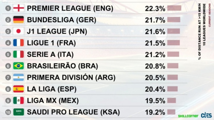 直播吧9月29日讯CIES盘点各联赛高速跑动距离占比排名,英超居首,德甲第二,西甲仅第八。(高速跑动定义:>15公里/小时)